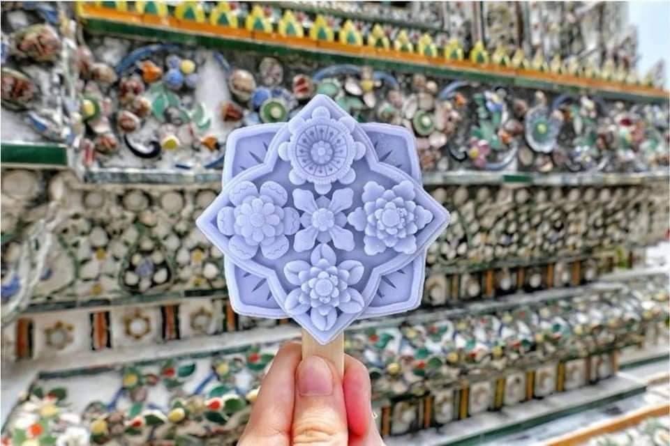 Această înghețată artizanală nu este doar un desert, ci o mini-operă de artă comestibilă. Realizată manual în forme care imită detaliile florale și ceramica smălțuită de pe pagoda centrală (prang), deliciul acesta răcoros păstrează estetica templelor thailandeze din secolul al XIX-lea. Culorile pastel – albastru pal, roz, verde mentă – sunt obținute din ingrediente naturale, iar aromele precum laptele de cocos, ceaiul verde sau mangoul parfumat evocă gusturile autentice ale Thailandei. Un detaliu la fel de delicat: după ce ai mâncat înghețata, pe băț vei găsi inscripționate citate inspiraționale – e ca și cum ai citi un răvaș.