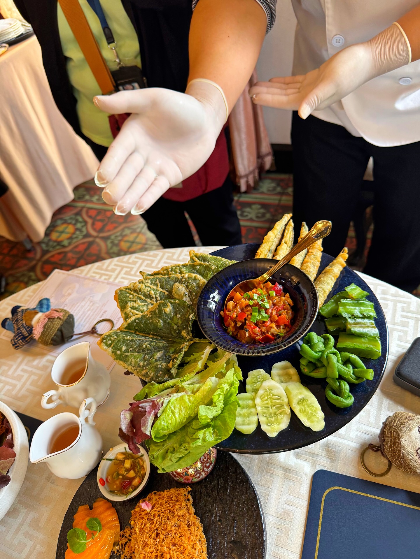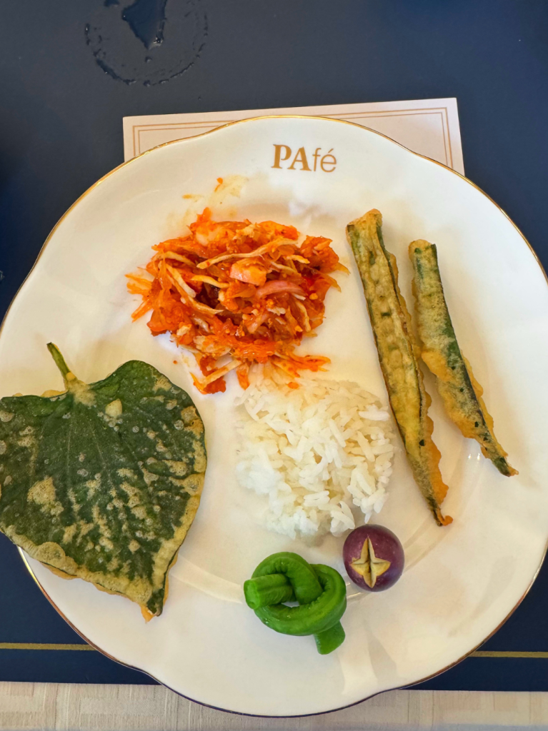 Dar o sa revin acum la festinul preparat de gazdele noastre de la PAfé. Pentru ca a fost un adevarat spectacol culinar, in care am incercat preparate din peste, din fructe de mare, porc si o multime de legume si fructe nemaiauzite. Denumiri ca: Pad Chai Po Waan, Moo Foy, Khao Chae, Look Kapi Tood, se succedau in meniu, iar noi eram vrajiti nu doar de gusturile ce ne incantau papilele, dar si de felul cum preparatele erau aranjate si servite. Ne-a fost facuta chiar si o demonstratie de catre chef-ul restaurantului, care ne-a pregatit pe loc o salata de mango delicioasa. Iar tot delicioase mi s-au parut legumele si frunzele prajite, care au fost o surpriza tare placuta din meniul de degustare de la PAfé.