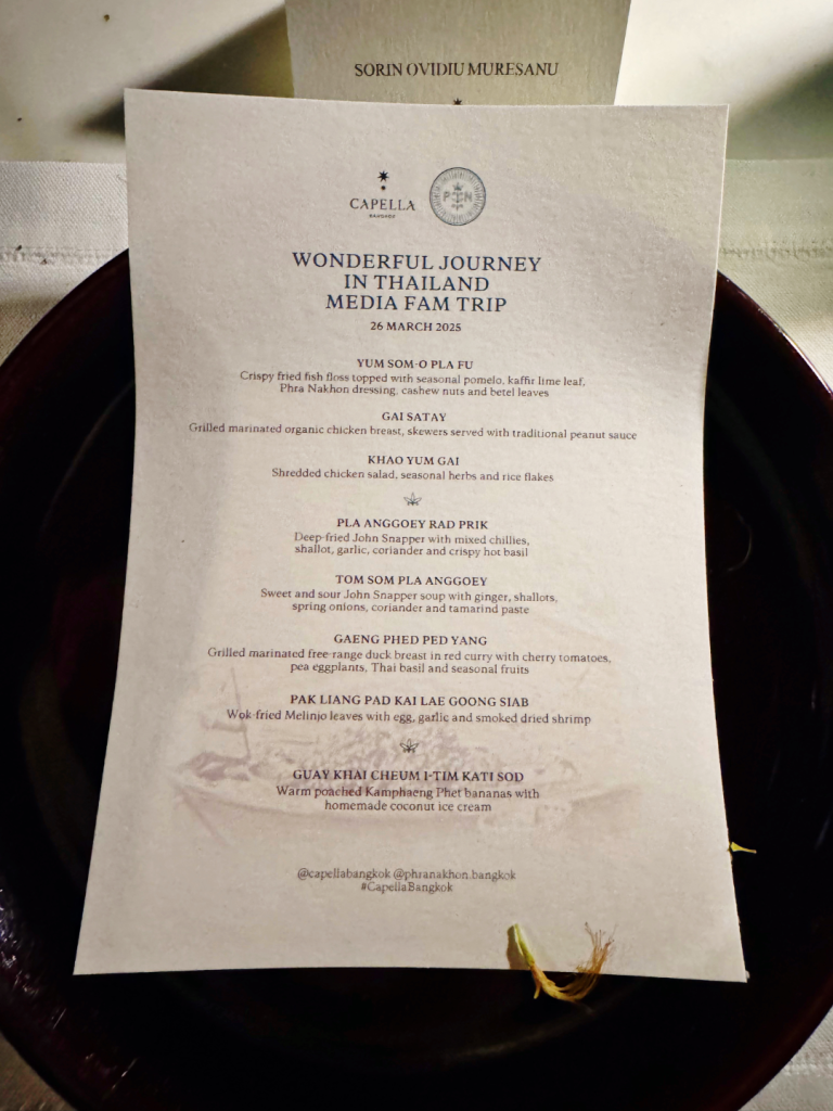 Cand v-am zis ca trebuie sa va bucurati la maxim de bucataria thailandeza, ei bine, exact la asta ma refeream: dupa o cina poate urma o alta! De data aceasta revenim la Phra Nakhon – restaurantul cu stea Michelin de la Hotelul Capella – unde de data asta m-am delectat cu preparate din meniul de cina. E unul din cele mai bine cotate restaurante din Bangkok, asa ca va indemn sa ii treceti pragul, sau sa luati loc chiar la terasa de pe malul Fluviului Chao Phraya.