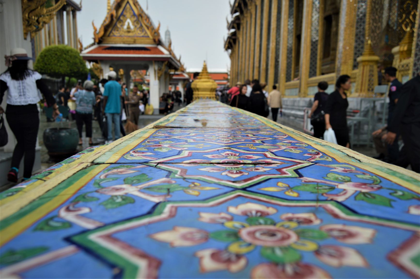 E 8 deja și căldura e în toi. Mă ia cu groază ce o fi pe la ora 1. Sper să nu leșin… Ne îndreptăm spre Palatul Regal. Nimeriserăm în Thailanda la două săptămâni după decesul Regelui Bhumibol Adulyadej. Pe stradă, în magazine, pe clădiri sunt arborate pânze negre de doliu. Toți angajații statului poartă pantaloni negri și cămașa albă. O săptămână au fost închise toate restaurantele și cluburile din Thailanda în semn de respect. Pe stradă sunt cărți de oaspeți în care poți să scrii câteva cuvinte în memoria regelui și se dă și pomană, ca să zic așa. Un suc, apă și fructe. Înțeleg din discuția cu Tik că a fost tare iubit regele ăsta al lor. Ne povestește că a plâns o zi întreagă când a aflat că a murit. Asta în condițiile în care nu era chiar tânăr (undeva la 89 de ani), plus că era bolnav de o oarecare perioadă de timp, drept urmare nu e ca și când i-a luat prin surprindere. Mă uit la el și mi-e greu să îmi dau seama dacă ceea ce îmi povestește e real sau de nu. Discutăm despre fondurile alocate din averea personală a regelui pentru educație, pentru dezvoltarea zonelor rurale, despre proiectele în infrastructură și turism. Printre povești ajungem la Palatul Regal, pe numele lui lung Phra Borom Maha Ratcha Wang. Mno, ia să vă aud…
