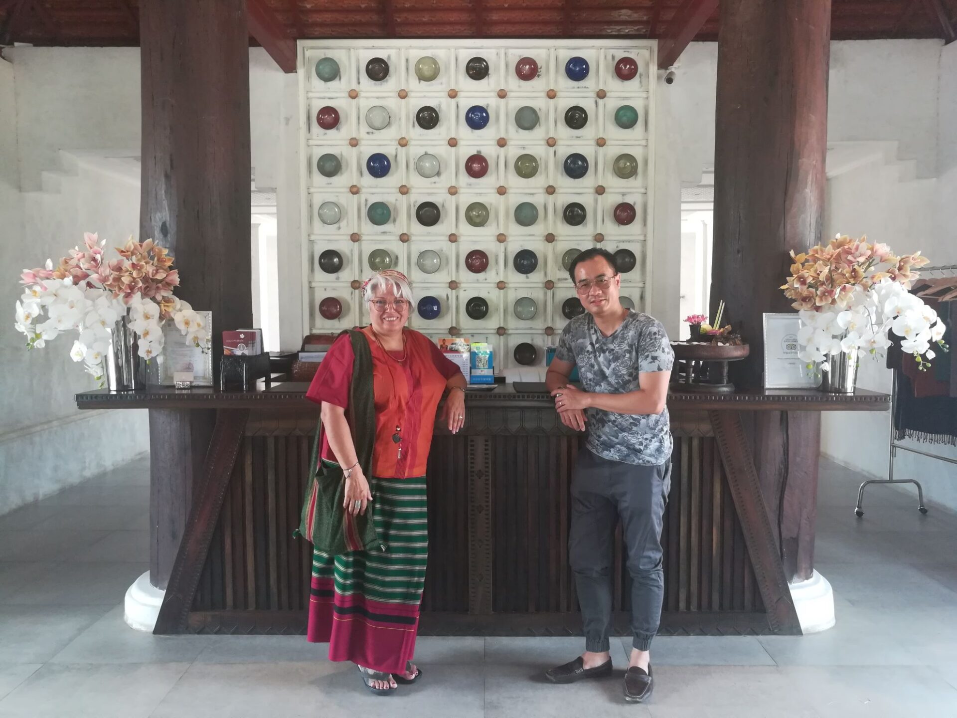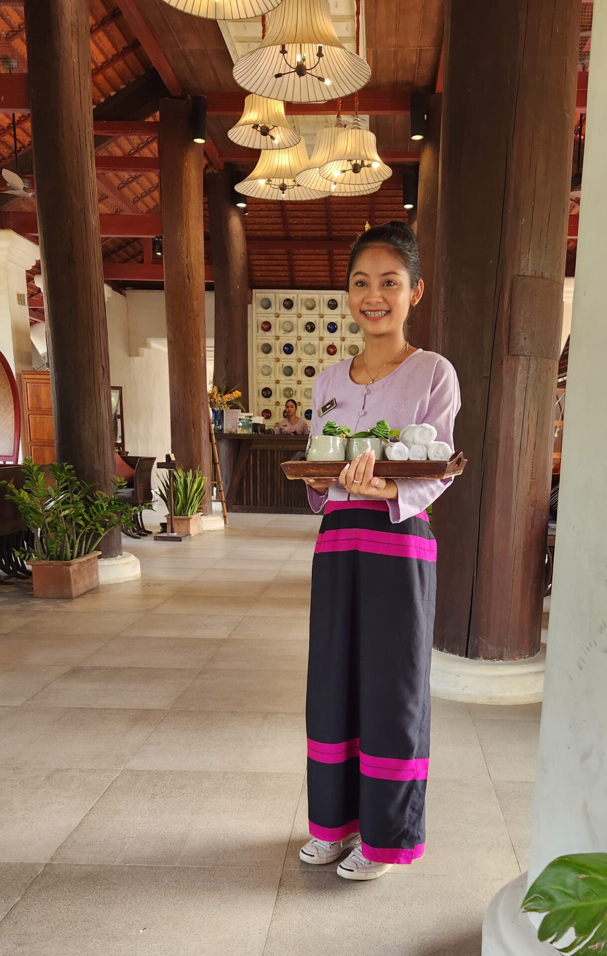 De fiecare dată observ cu simțuri treze. Întotdeauna, mirosul — nu parfumul generic de hotel, ci ceva vegetal, aproape crud – poate lemongrass, poate frangipani. Uneori, felul în care lumina cade pe lemn sau pe piatră, sau cum cineva aranjează calm o vază cu flori, ca și cum nimeni nu se uită. Sau amplasarea decorurilor, statuete și țesături tradiționale, uneori artefacte veritabile, la vedere și îndemână – căci sunt și recepții intime, aproape ceremoniale.. Alteori, remarc ținuta gazdelor ce îți oferă paharul cu infuzie mov de Butterfly Pea și prosopelul rece, umed și parfumat.